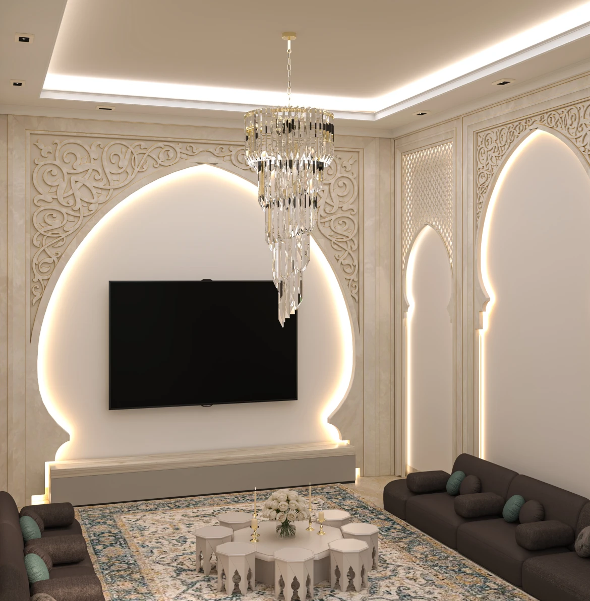 راعت شركة Decorner في هذا التصميم احتياجات الأسرة العصرية، مع الاحتفاظ بالطابع الشرقي وإظهاره مع لمسة حديثة.