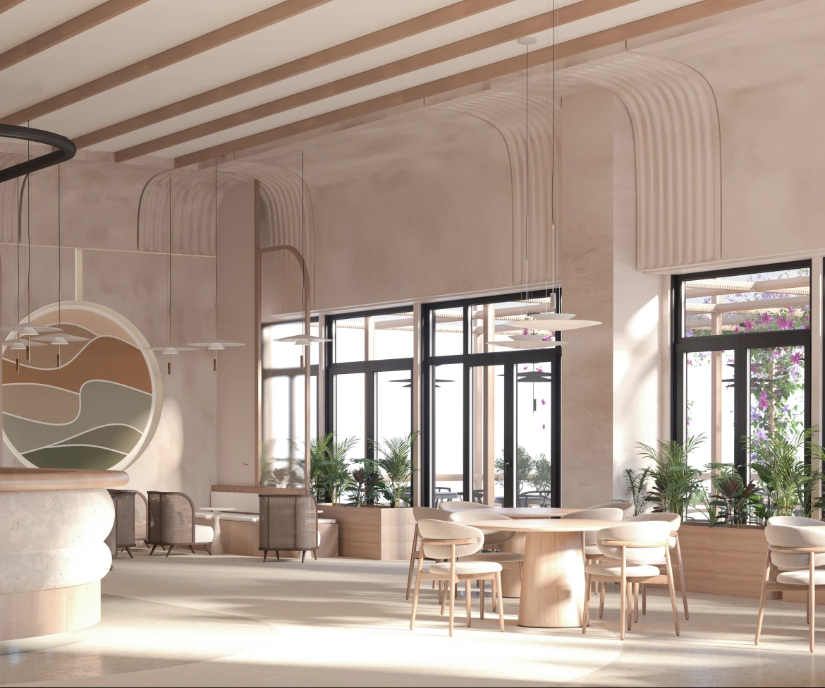Small tables and comfortable, spaced-out seating occupy the café space, carefully coordinated under greenery-adorned light fixtures, offering visitors a sense of calm and tranquility, and enticing them to spend extra time in this comfortable oasis reflecting the latest interior design styles applied by the creative team at Decorner!