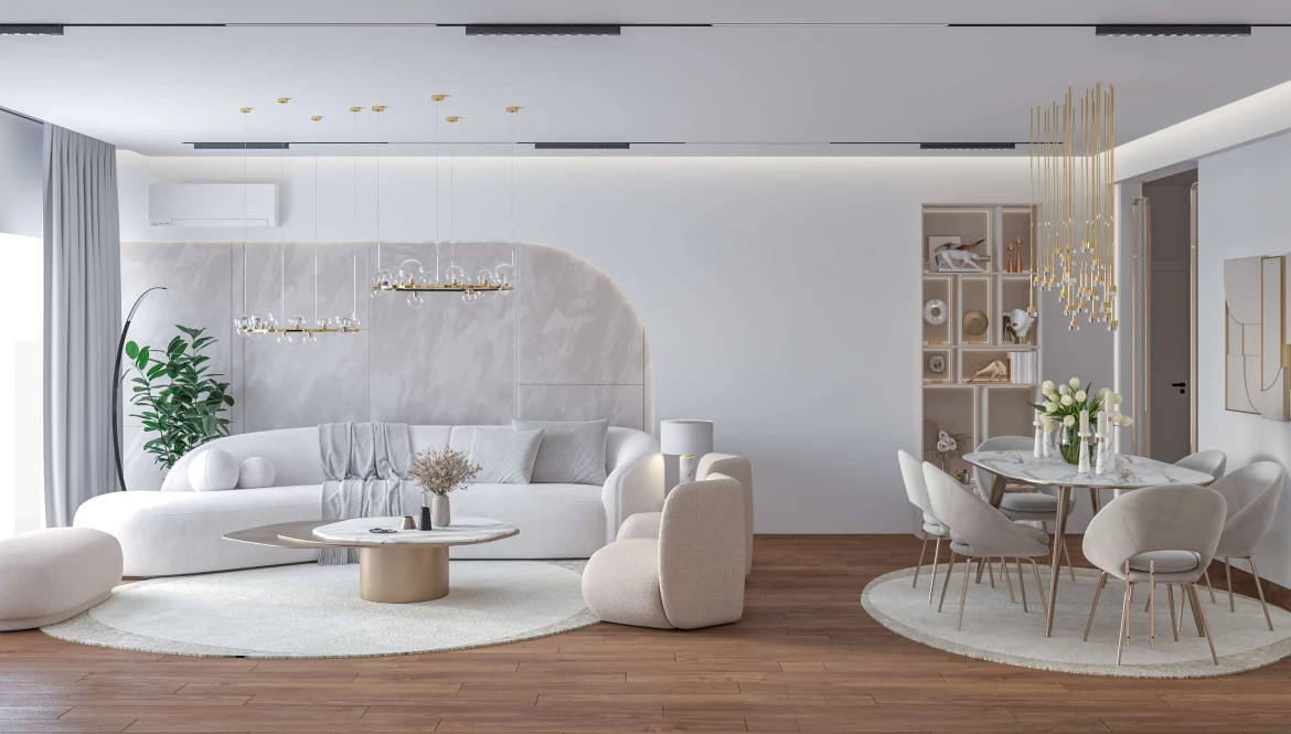 An apartment designed in a cloud-inspired style, making its inhabitants feel as though they are floating in a space of sophistication, expansiveness, and relaxation.